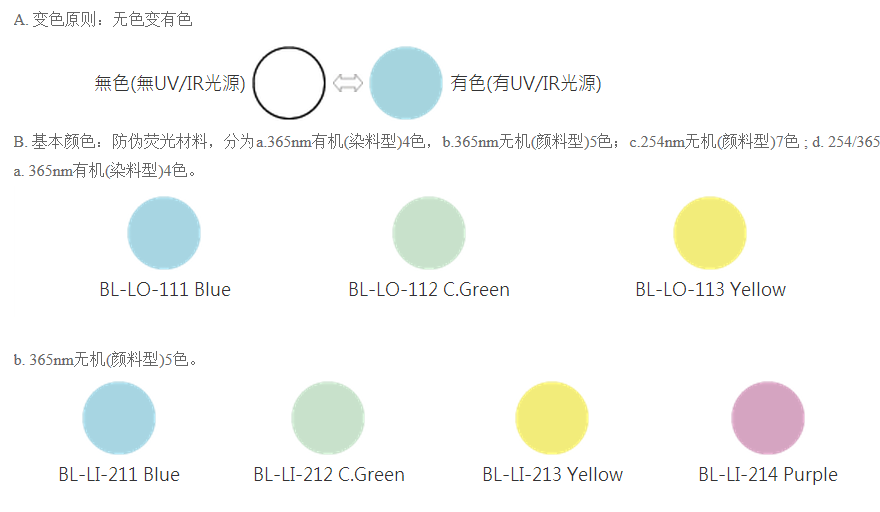 本系列產品特殊熒光體在可見光光源下,呈現(xiàn)白色或接近透明色,在不同波長光源下(254nm、 365 nm、 850 nm) 顯現(xiàn)一種或多種熒光色澤,包括有機、 無機、余暉等特殊效果,色彩鮮艷亮麗,熒光標識材料主要用于生產防偽油墨和標志塑料。